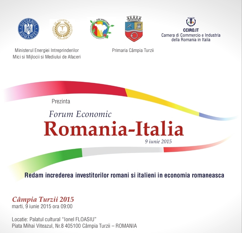 Camera di Commercio e Industria della Romania in Italia (CCIRO Italia) lancia in Romania la serie di forum economici “Ridiamo sicurezza e concretezza alle aziende romene ed italiane nell’economia romena”. Il primo evento di questa serie si svolgerà a Câmpia Turzii, il 9 giugno 2015, ore 09:00 e come sempre sarà organizzato in stretta collaborazione con il Ministero dell'Energia, Piccole e Medie Imprese e Ambiente d’Affari e la Camera di Commercio e Industria della Romania.