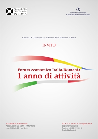 Il “Forum economico Italia-Romania 1 anno di attività” si svolgerà venerdì 18 Luglio 2014 alle ore 15:00 presso l’Accademia di Romania (Piazzale José de San Martin 1- 00197 Roma) nel corso del quale la Camera di Commercio e Industria della Romania in Italia presenterà alcuni dei risultati e degli obiettivi da raggiungere.